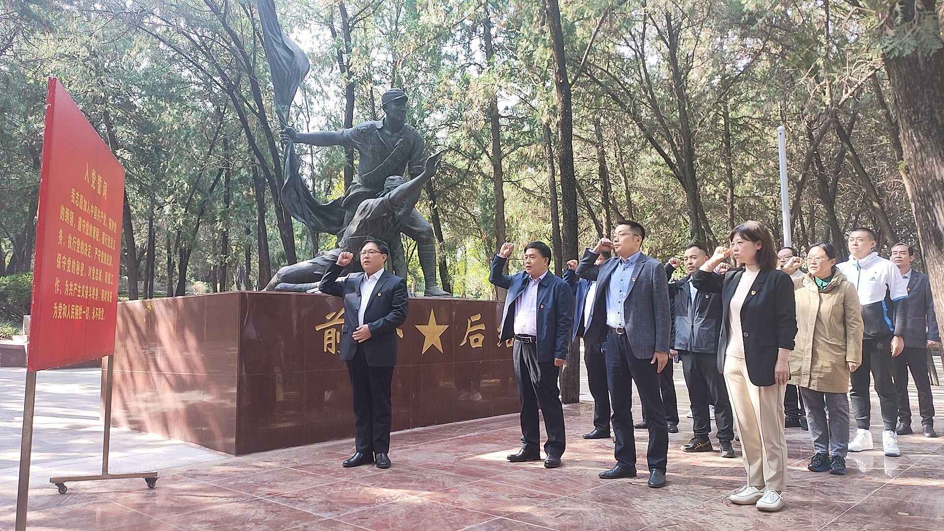隨后在革命烈士紀(jì)念雕像前,大家懷著無(wú)比崇敬的心情向烈士默哀肅立,向革命烈士敬獻(xiàn)了花籃,銘記烈士們?yōu)榻夥艊?guó)家和民族不惜犧牲生命的大無(wú)畏精神。全體黨員在鮮紅的黨旗前,高舉右手,集體重溫入黨誓詞,展現(xiàn)了“不忘初心、牢記使命”的堅(jiān)定意志和決心。