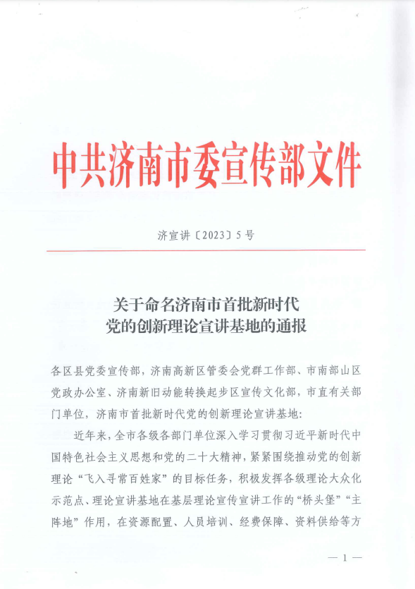 近日,中共濟南市委宣傳部印發(fā)通知,公布“濟南市首批新時代黨的創(chuàng)新理論宣講基地”名單,濟南城市投資集團位列其中。